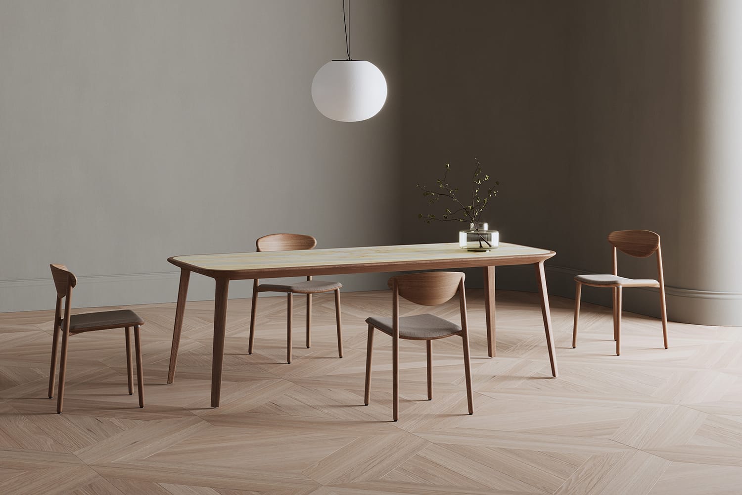 A combination of beauty of the material, the wood basis and ceramic or leather superstructure, is bound in this collection by the common element: a calotte. A subtle association to the spherical form, to a segment of this perfect shape, is immersed in the warmth of wood, in a curved mould, like a negative embracing a body. The piece is completed by a flat surface with a contrasting tone and texture, ceramic or leather inserts, trimmed with wood, like an elegant cross-section, a calotte surface. The functional horizontal place remains visually accentuated by means of the material’s aesthetic sensations, textures in seductive light and dark versions, accompanied by the imperative of the tactile, of touch.