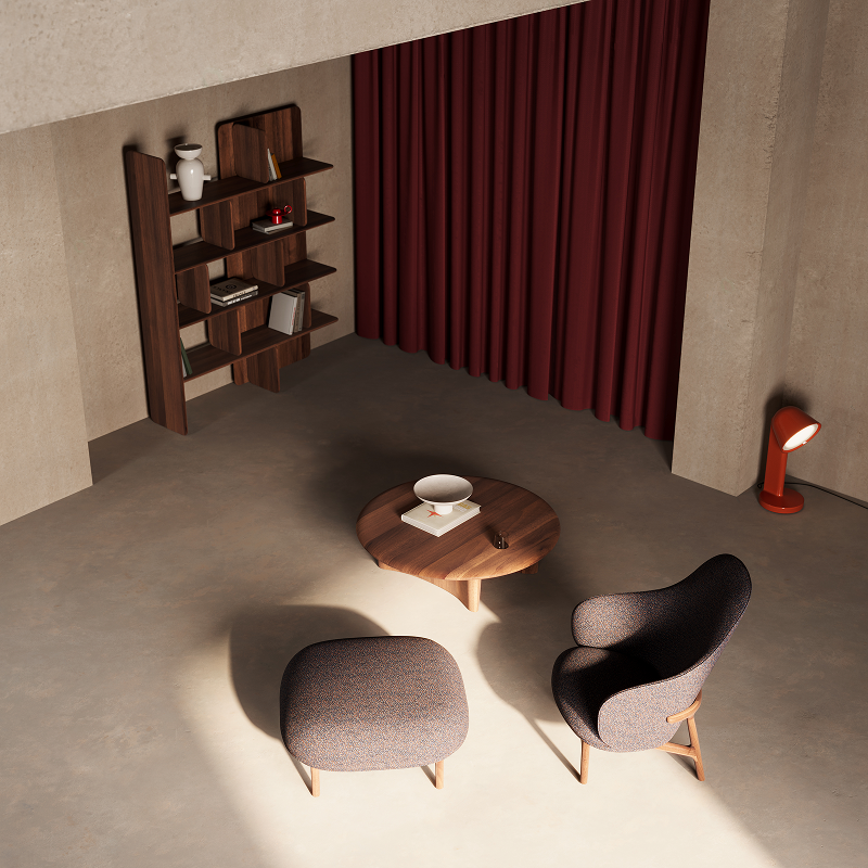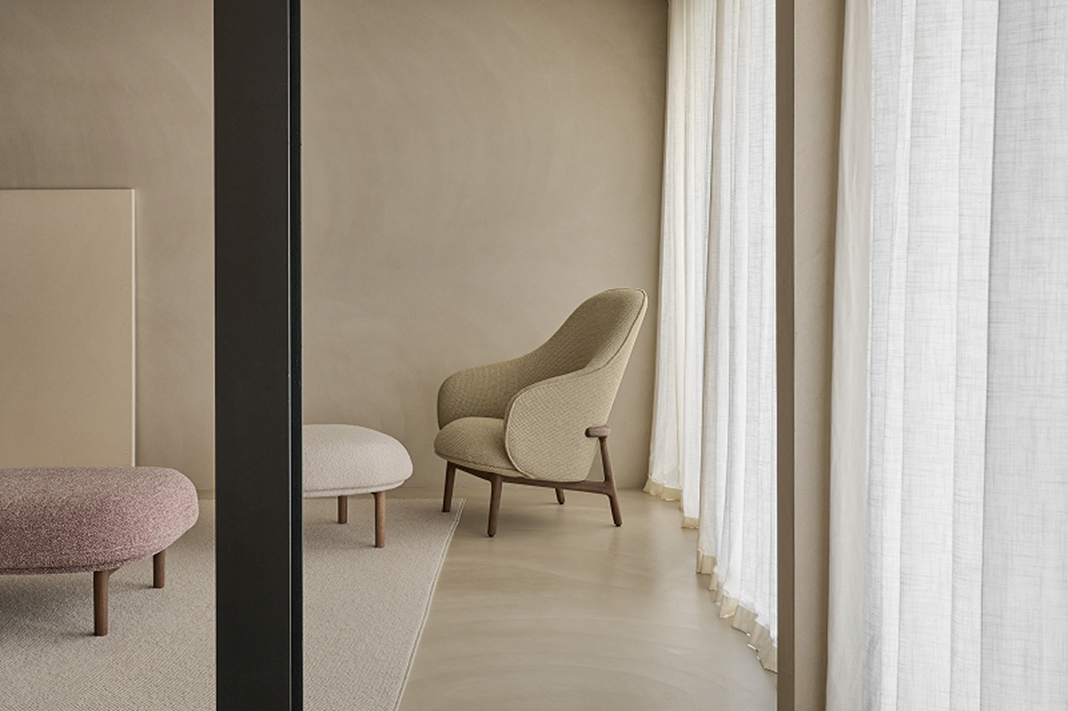 Varieties of upholstered seating furniture of perfectly curved lines provide inviting comfort and refined aesthetics. Like a comfortable soft shell, Mela envelops a space of relaxing sitting, ergonomically suited to the purpose and the user needs, thanks to proportional variations in height and width. The dominant seat and backrest volumes are upholstered and soft-filled, connected by a practical complementary interplay: the backrest follows and outlines the edge of the seat, adheres to it, creating a pleasing soft membrane. The compact and visually elegant solid wood structures complete the picture, encompassing and connecting the seat and the backrest, providing a sense of safety and beauty.