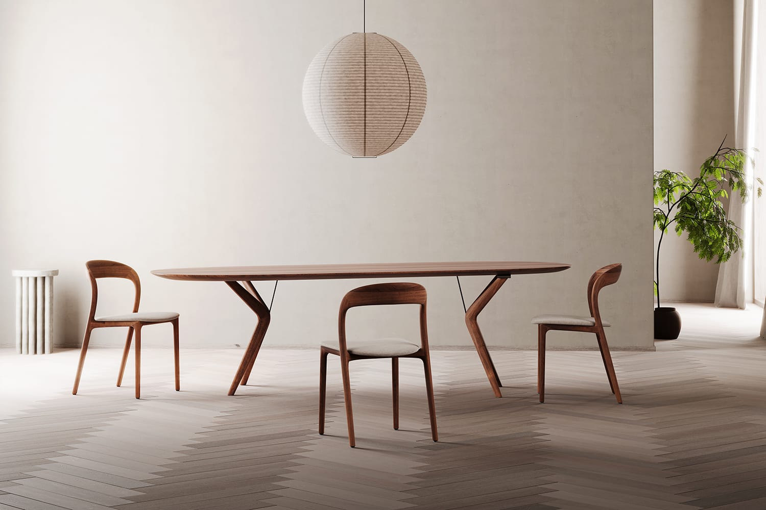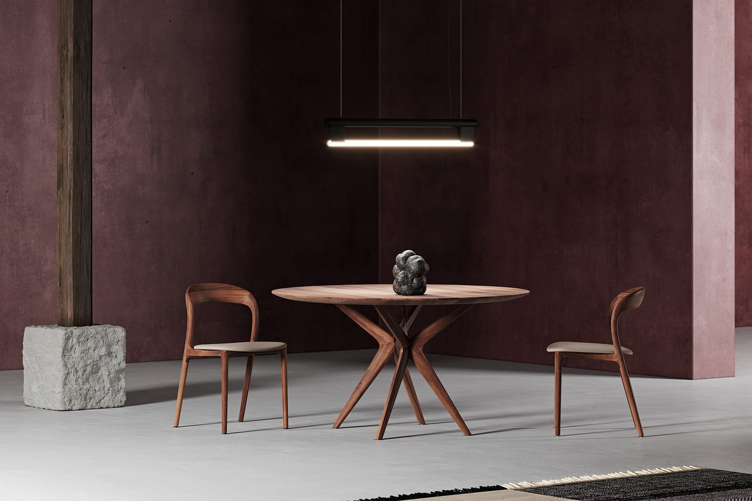 A simple chair always needed and desired quite naturally stems from the idiosyncratically penned signature lines of the Neva collection. A minimalist approach to elements has been adapted to use to a maximum degree; a visual lightness accompanies the lightness of the body. Its feature backrest, ergonomically bent, softly transitions into the legs, creating a compact, firm support, visually highlighted by the expressive ongoing line. A simple seat completes the piece, underlining the alluring curves of the line it leans on. In addition to the wooden version, an upholstered model is also available for added comfort. Lightness and strong design character bring in variations in aesthetics and quality with a selection of different types of wood and including colour and texture of the material in the final feature. A maximum of character and comfort has been achieved with a minimum of dimensions. This sophisticated minimalism is a perfect fit into smaller spaces and successfully maintains its characteristic visual appearance in opulent interiors as well.