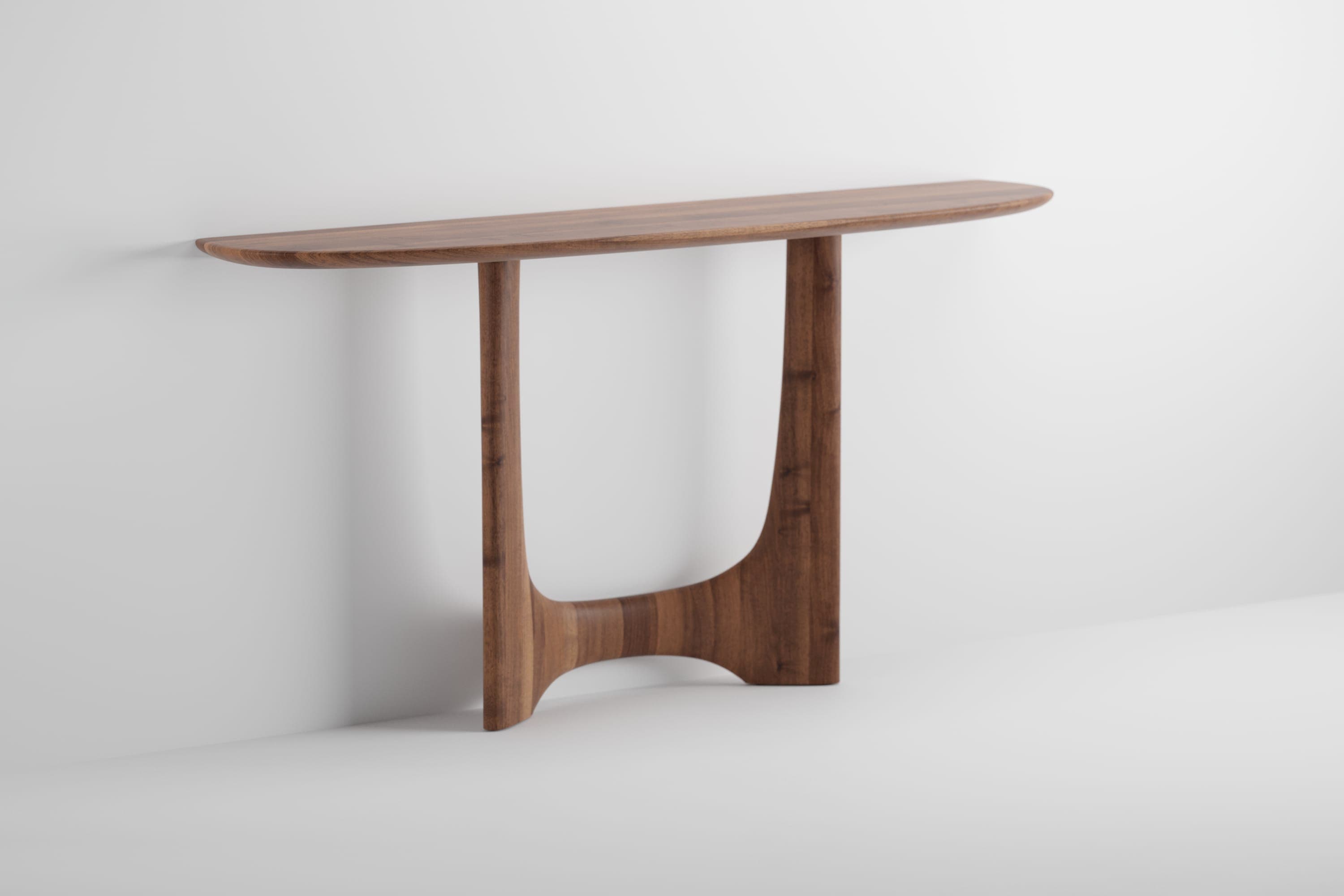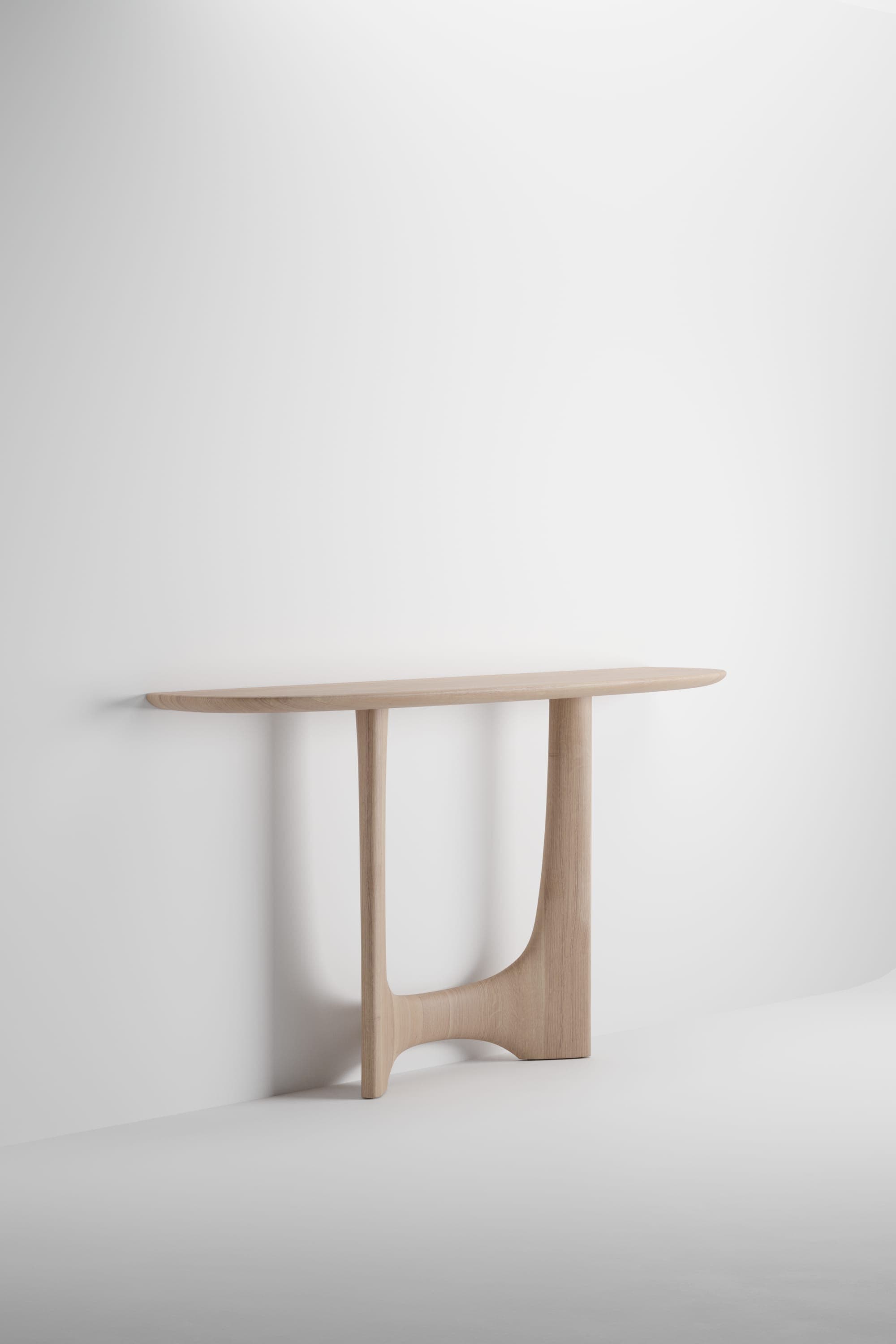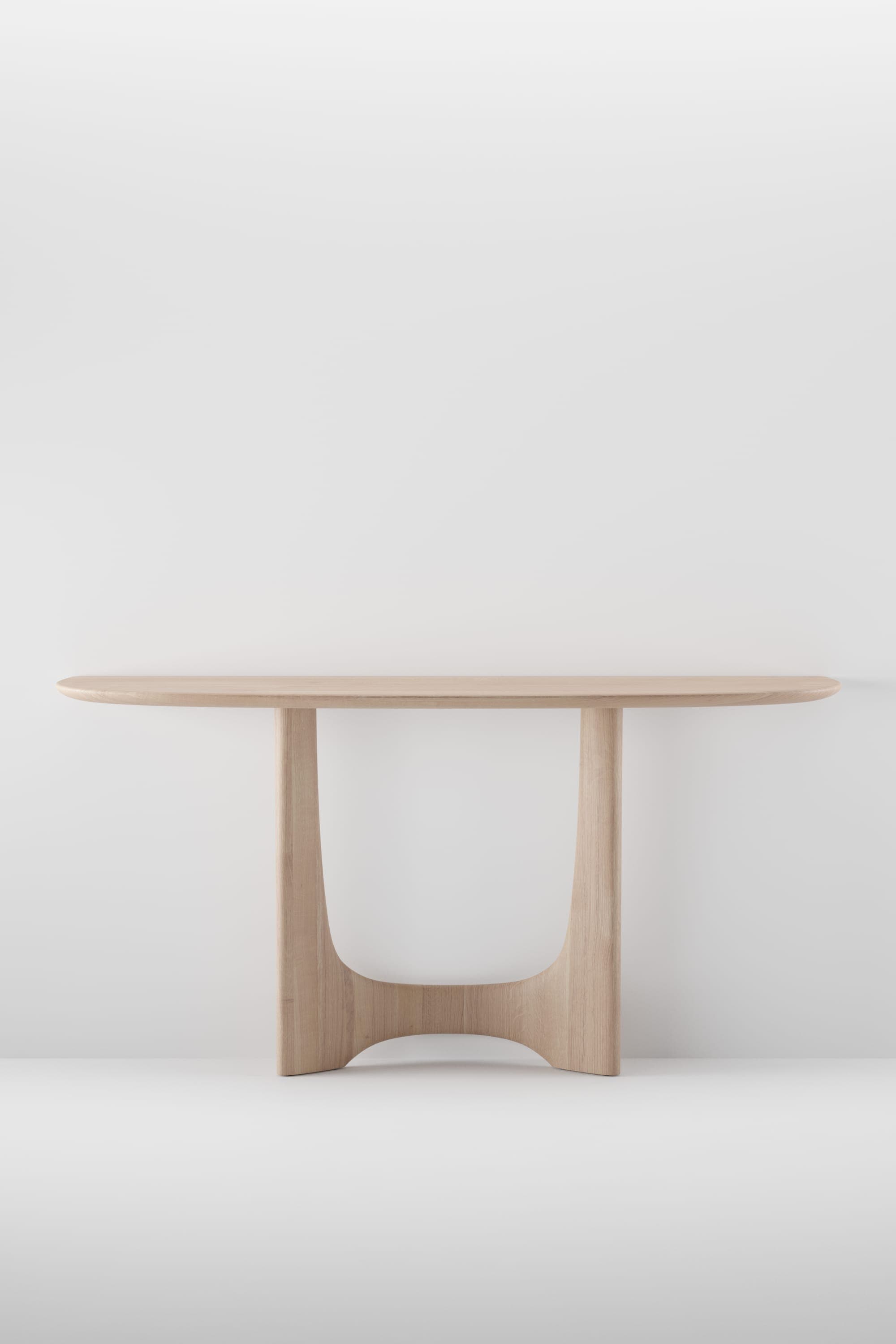 The Oskar Collection includes tables and consoles crafted from solid wood, distinguished by sculptural legs inspired by modernist column designs from Brasília. Fluid transitions between horizontal and vertical elements create an architectural silhouette that is both dignified and understated. Each piece is made from carefully selected solid wood, precisely milled and finished by Artisan’s skilled craftsmen. The design incorporates knock-down construction for convenient transport without compromising stability. Tables feature an oval-shaped tabletop with a prominent seating position on one side, subtly suggesting social hierarchy in a positive and respectful way. Consoles derive from the table design, using the wall as a section plane that reveals and utilizes the H-shaped support element.